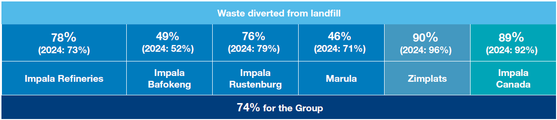 Wherever feasible, we aim to realise this goal through self-sustaining circular economy initiatives that reduce environmental impact and create employment opportunities within our host communities. Implats has set an interim target to divert 80% of waste from landfill by 2030. In 2025, we diverted 74% of general and hazardous waste (2024: 75%) away from landfill against a target of 73%.